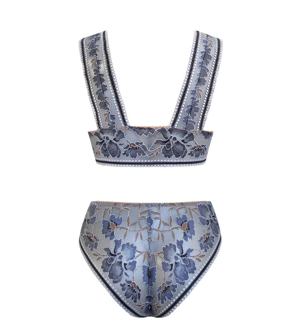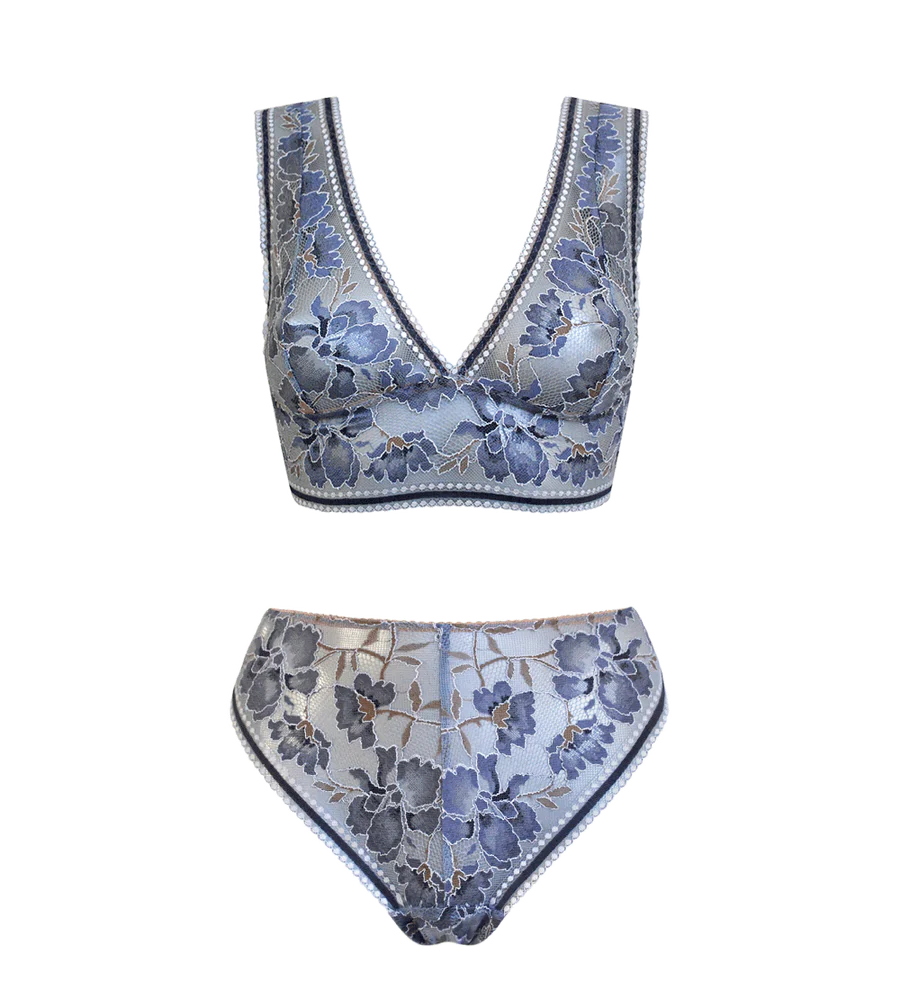 Blue Amber is a soft decorative set with flattering lace edges throughout creating a second skin effect and seamless finish under garments. The bralette is designed without padding or wire and the medium waist panty has a high cut leg and Brazilian back coverage enhancing your natural beauty.