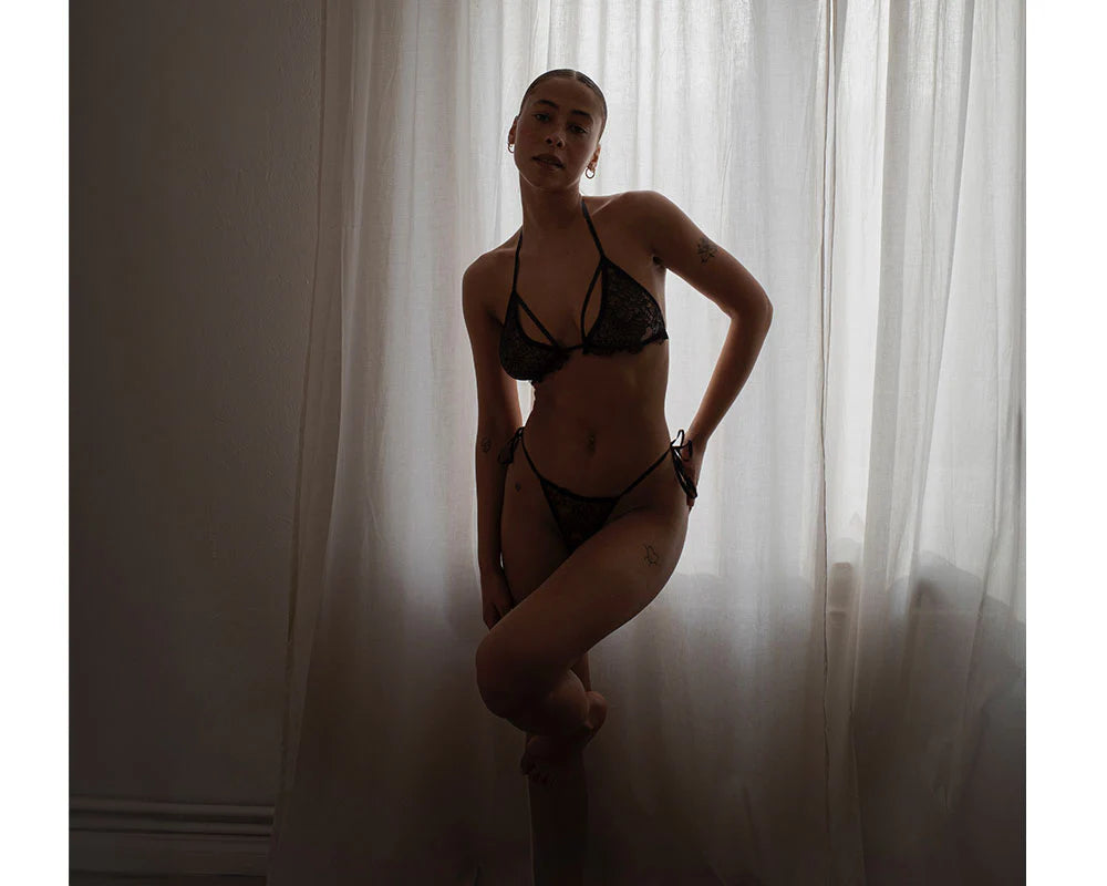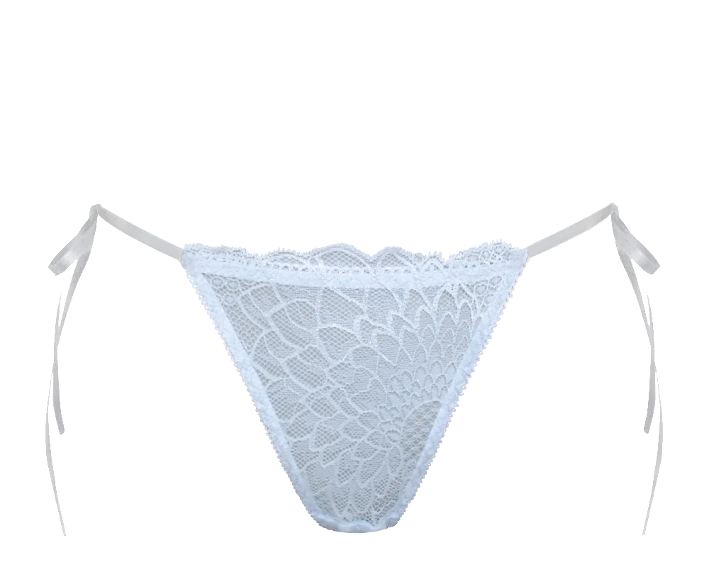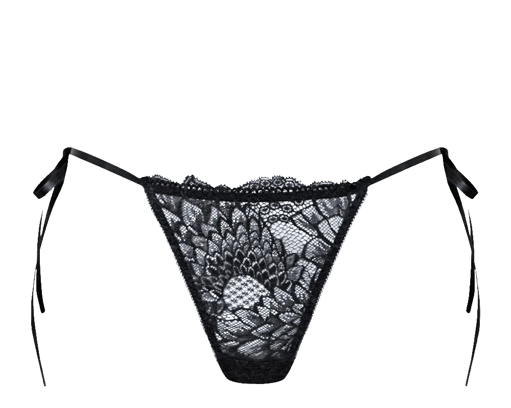 Lightweight and delicate, this feminine and playful string panty feature a decorative floral lace and satin bands that closes in the sides.