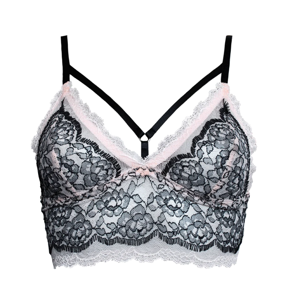 Cut from a super soft and stretchy lace adorned with an exclusive pattern, the background has a soft rose color with black florals and frills. This longline style bralette offer light support and has non-wired, unpadded triangle cups and adjustable shoulder straps. The decorative edges forms to the contours of your body like a second skin.