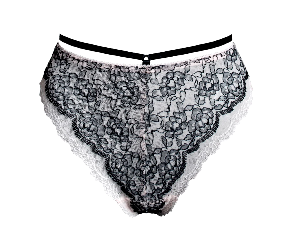 A high-waist panty made from a lace with exclusive pattern, with a soft rose color background and black florals and frills. Designed with a flattering high cut leg and soft lace edges creating a seamless finish under garments. The stretchy lace is comfortable to wear and the Brazilian half back coverage boost sensual allure.
