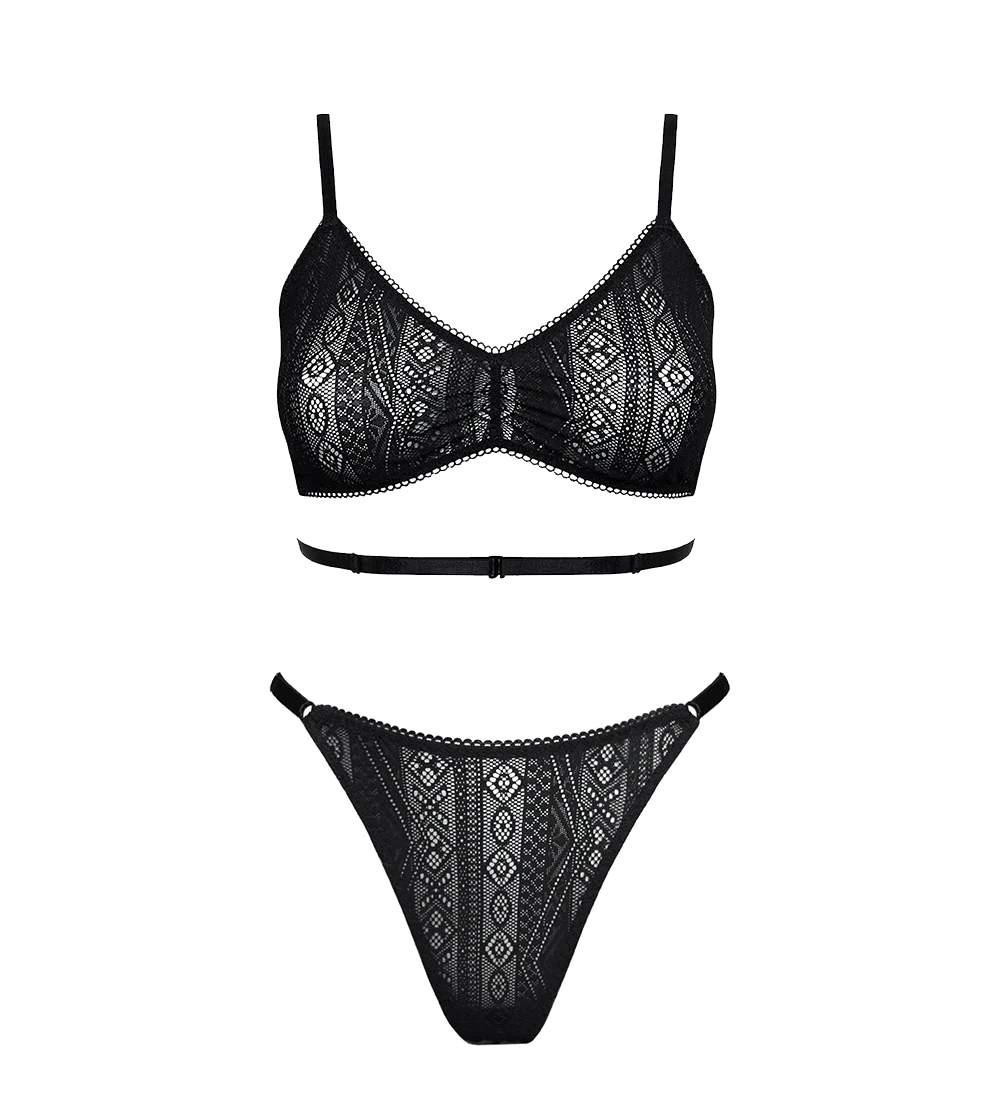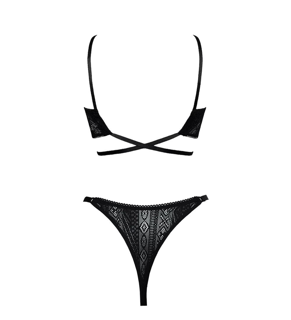 Cross over low back bra combined with a thong designed with high cut leg and adjustable side straps. The geometrical lace is soft and comfortable and reveal just the right amount of skin. The bra is made without padding or wire so that the stretch forms to the body enhancing your natural shape, and closes at the front with a wrap around strap leaving the back sensually uncovered.