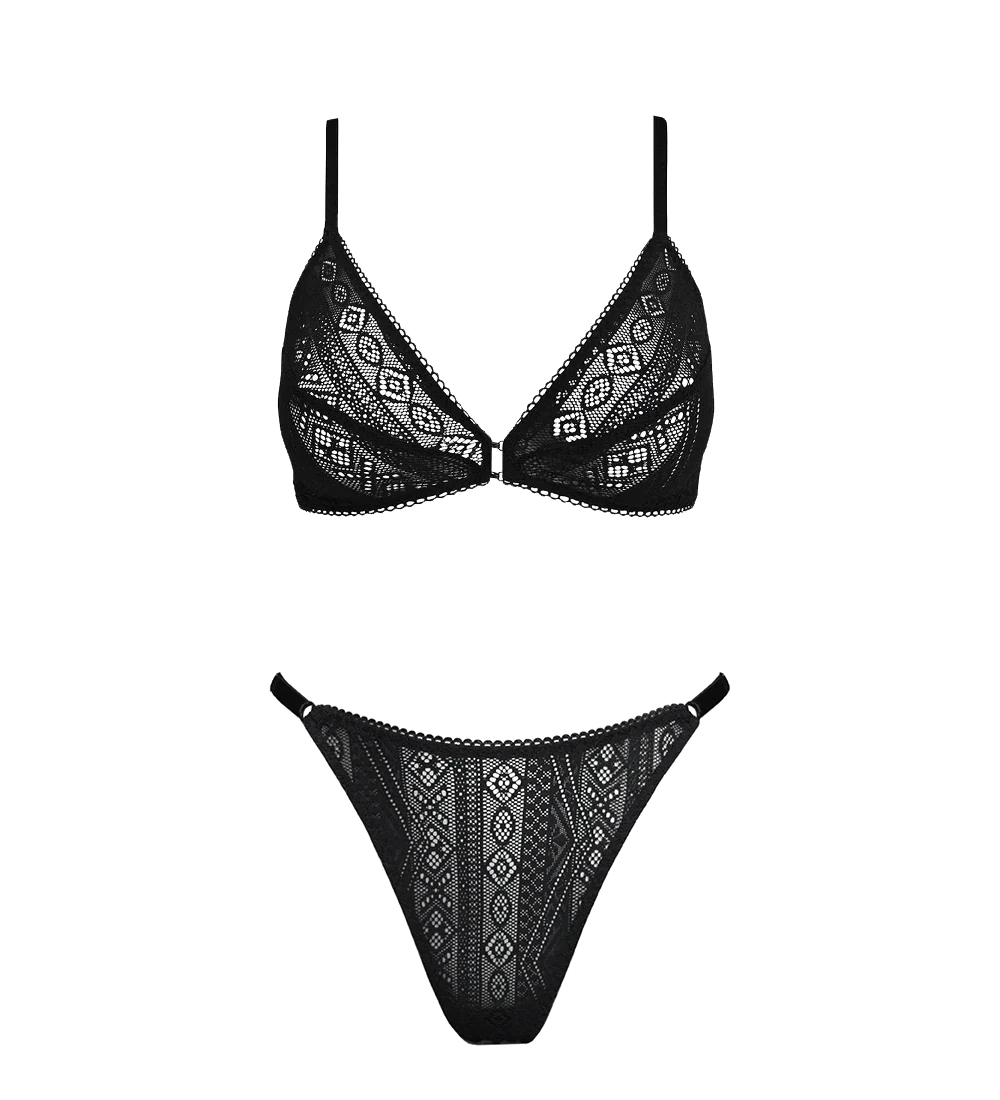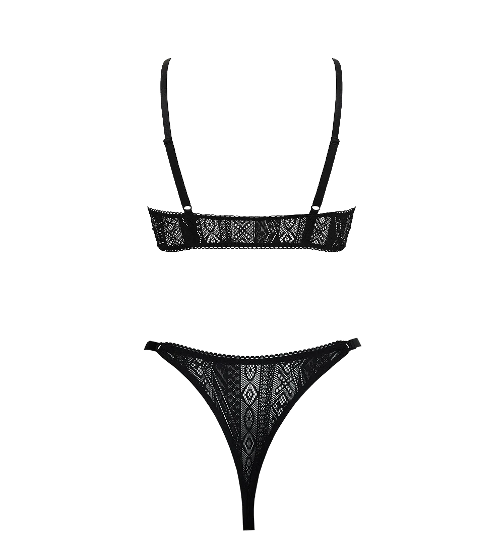 Soft cup bra featuring front hook closures combined with our high cut thong with adjustable side straps. The geometrical lace is soft, stretchy and comfortable and reveal just the right amount of skin, while forming to the body enhancing your natural shape. The bra is made without padding or wire and has adjustable shoulder straps and the low waist panties offer medium back coverage and are lined with organic cotton crotch.