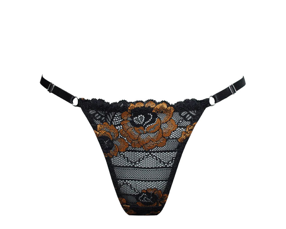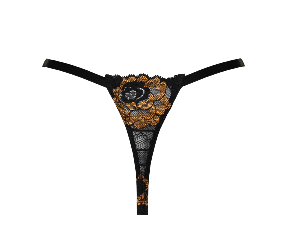 For your special occasions we've design this golden string that breathes romance and extravagance. Dharma String is a desirable piece made in black with golden flowers in the lace that extends from the front into the back thong. The string sides are soft and adjustable to fit perfectly on your hips and to be discreet under clothes.