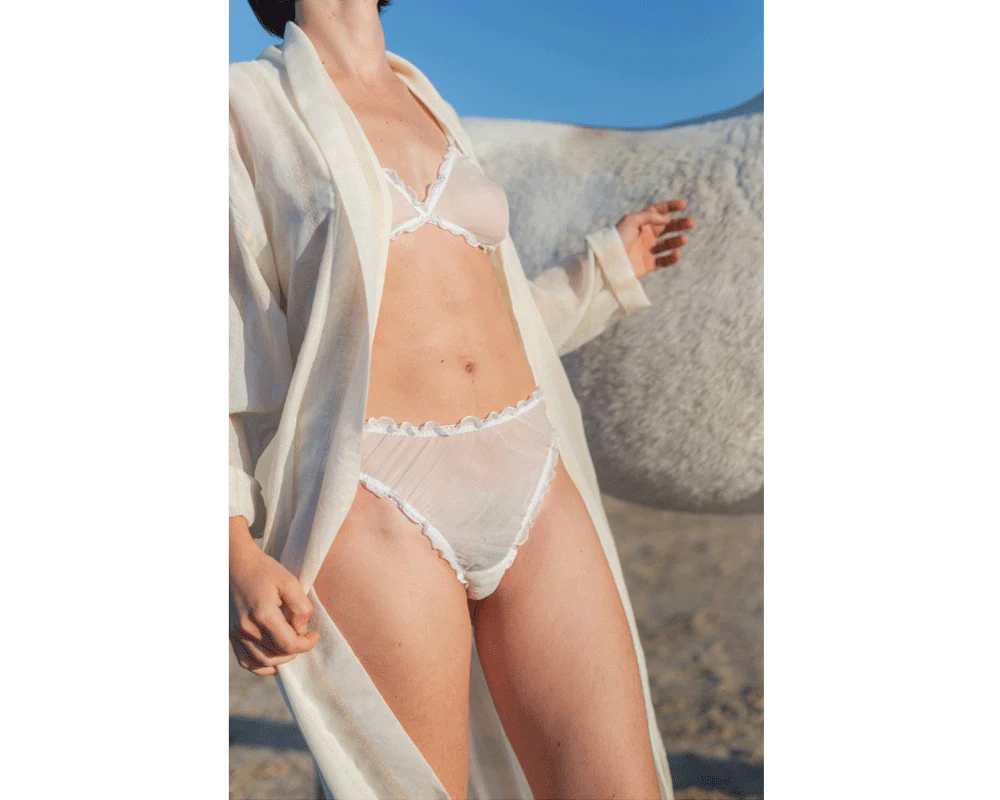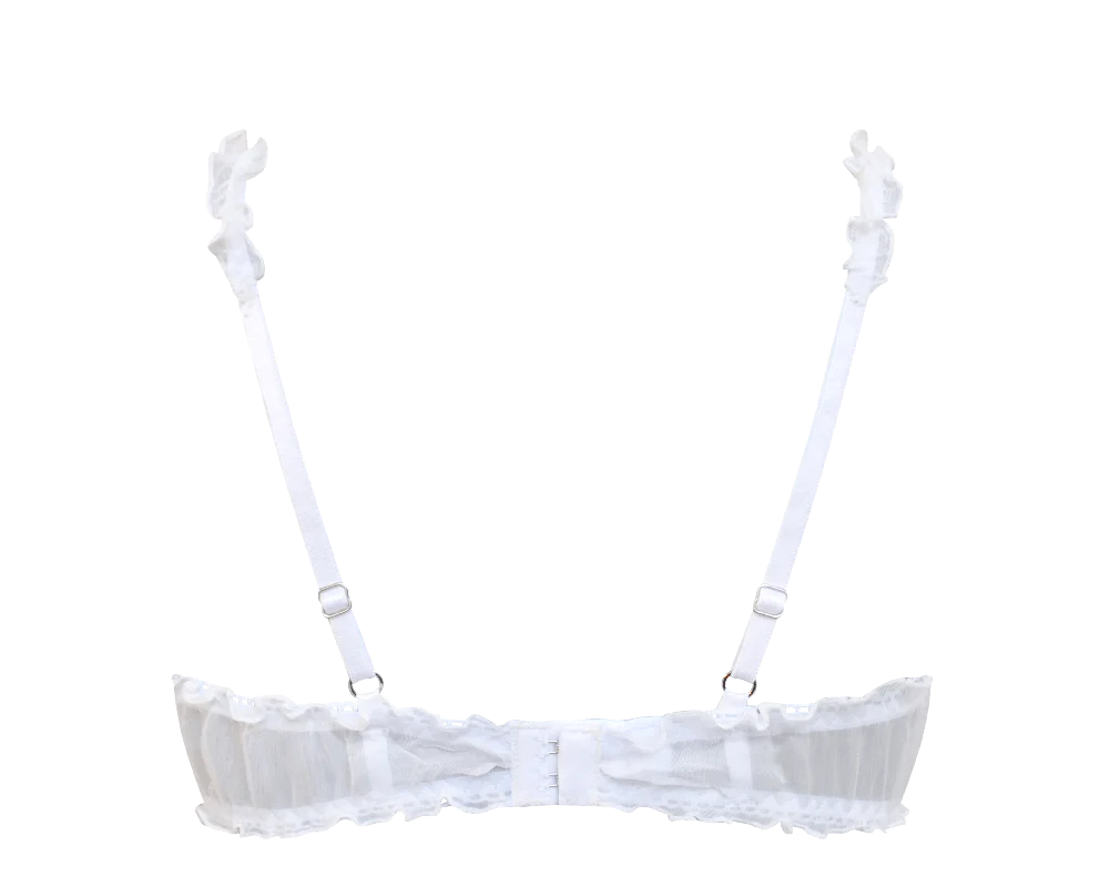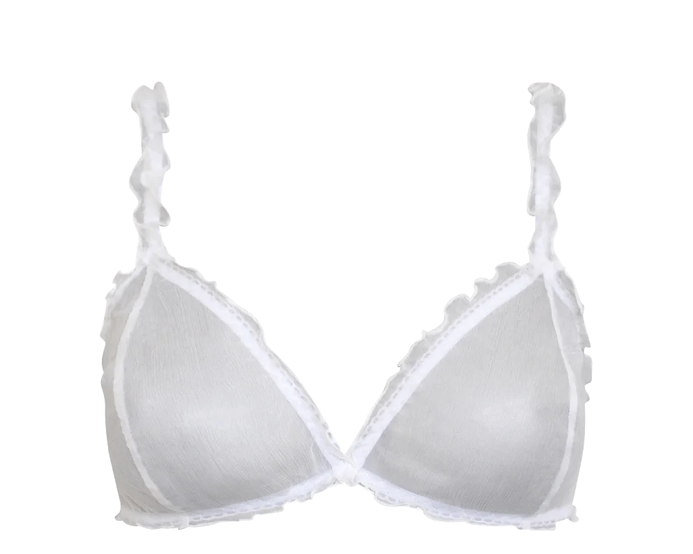 Awaken your senses wearing sheer silk lightly touching your skin. This feminine bra is framed with swirling edges decorating the chest and body. Crafted from 100% silk surplus sourced in Italy, it features adjustable shoulder straps and closes with an adjustable back clasp.