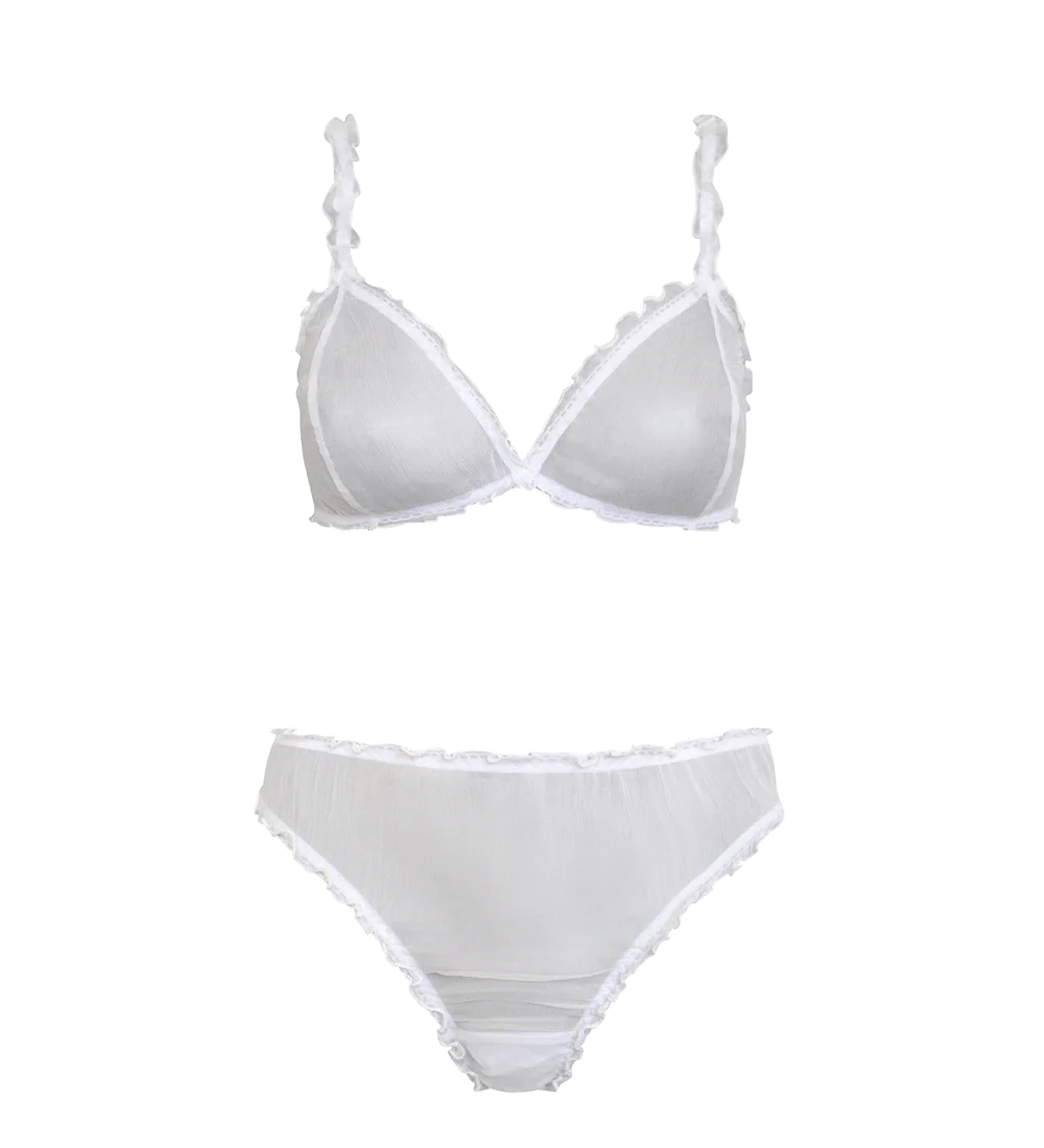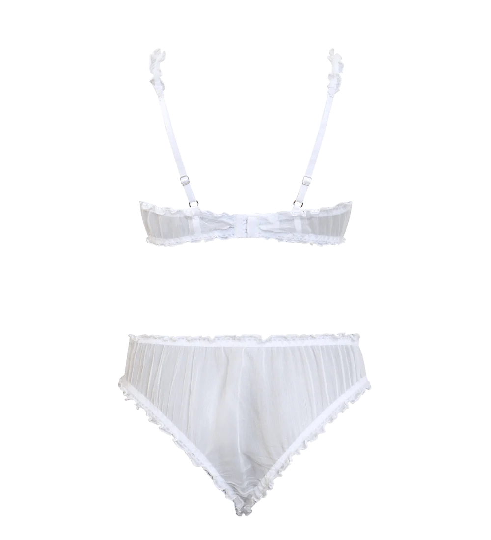 Awaken your senses wearing sheer silk chiffon lightly touching your skin. A feminine set framed with swirling edges, the soft bralette comes without padding or wire, has adjustable shoulder straps and closes with an adjustable back clasp. Paired with a pantie that you can place low on the hips or higher towards the waist, just how you like it, and it shows just the right amount of cheeks.