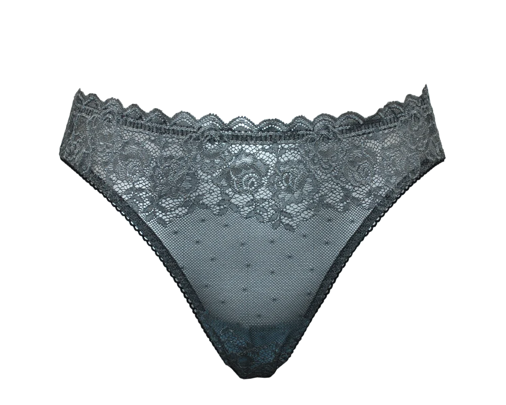 Enhancing feminine elegance, this medium waist briefs are made in floral Jade coloured lace with decorative lace edges around the waist and soft elastics around the legs. Full back coverage.