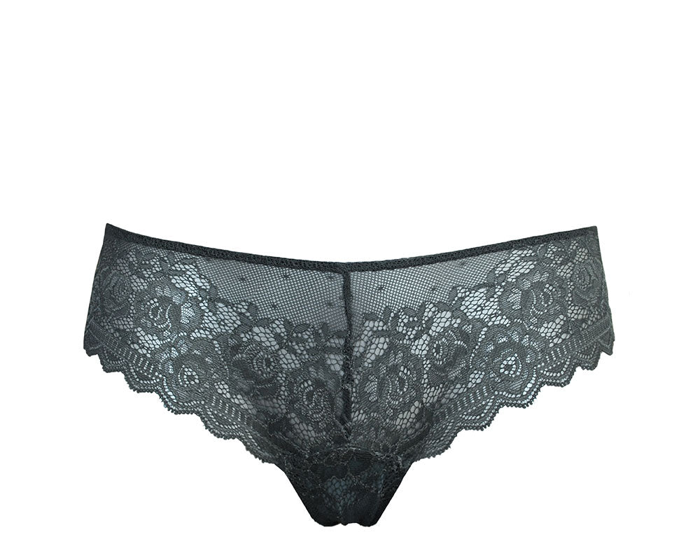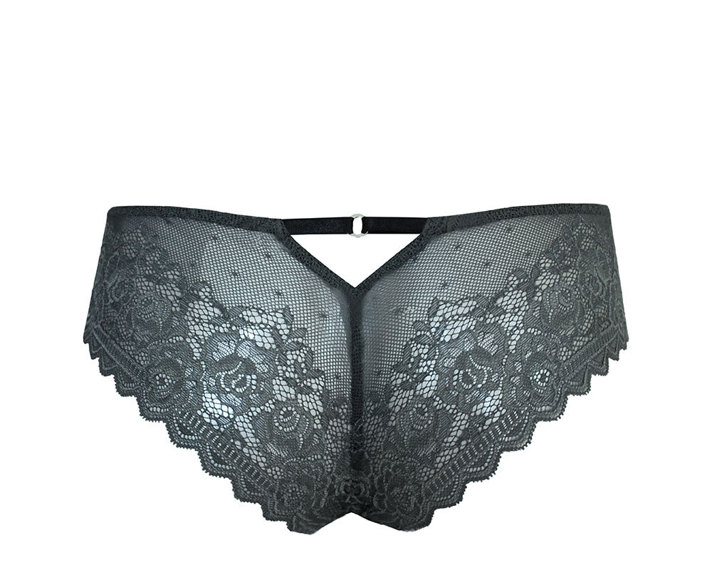 Brazilian cut panties crafted from a jade coloured lace, exquisitely detailed with a strappy cut-out detail and silvery ring in back. They are designed with low waistline and smooth, decorative lace edges making them flattering to wear under figure hugging styles. Match with Jade Soft Bra or wear with a black bra matching the black strappy detail.