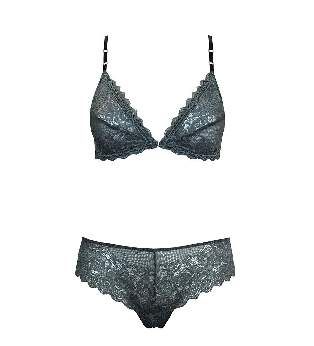 Jade is a set with exquisite details and sheer appearance adding a sensual touch to its contemporary shape. The non-wired, unpadded bra is combined with brazilian cut panties with half back coverage, featuring decorative lace edges, black straps and silver rings details.